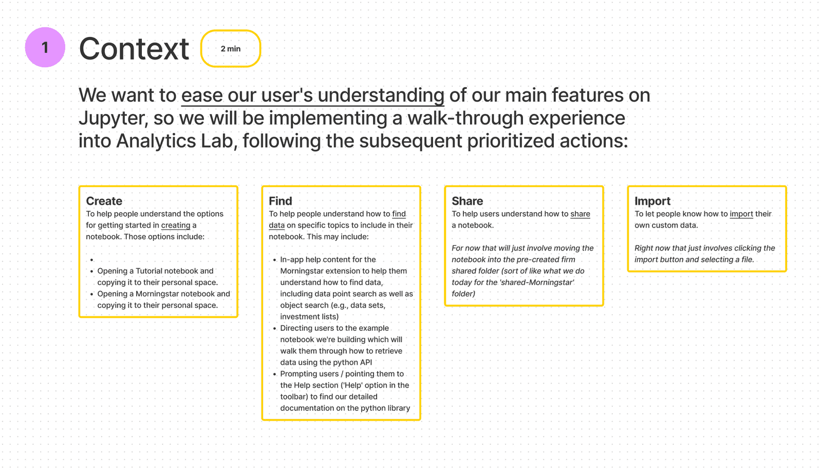 The implementation of this methodology was a success for the task’s primary need because we gathered a small but diverse group of people made up of different roles and disciplines with profound product knowledge and expertise focused on finding the best approach to a design challenge. The client did feel comfortable and satisfied with this methodology as an excuse to know better the team members, the goals, the users, and the product.